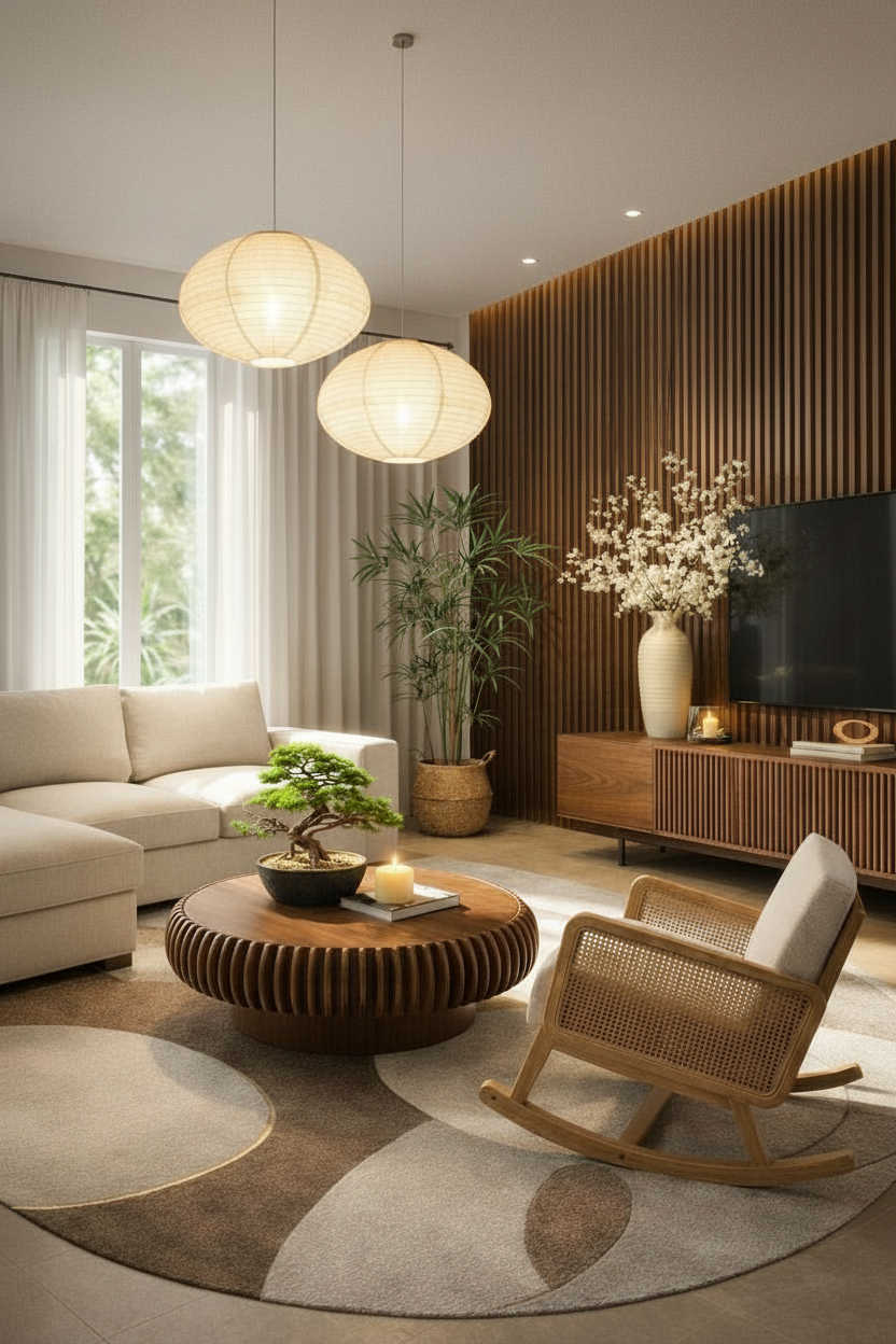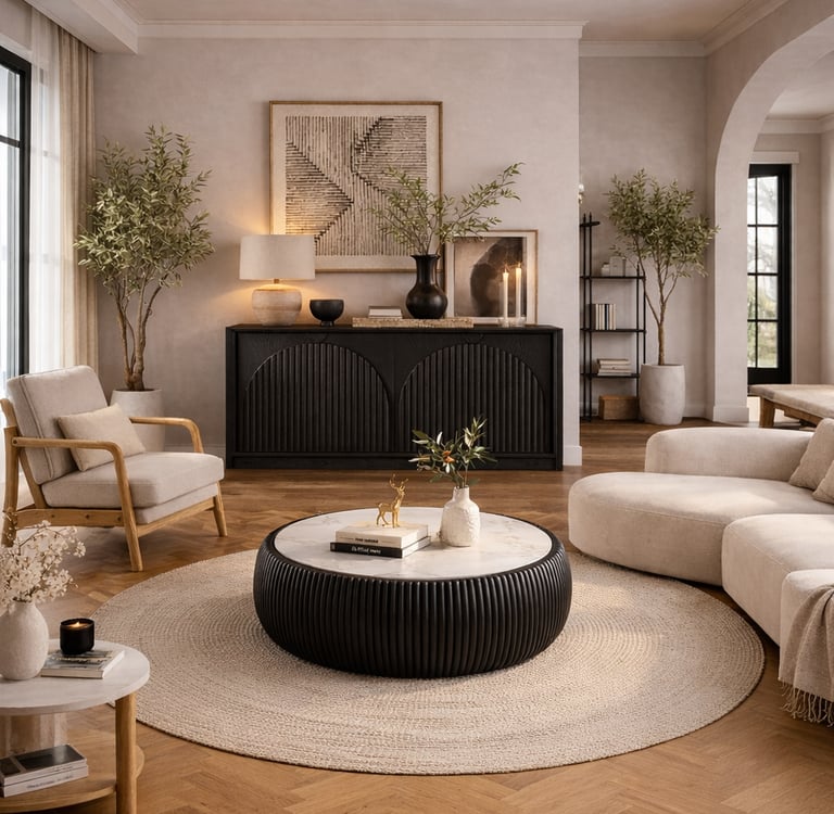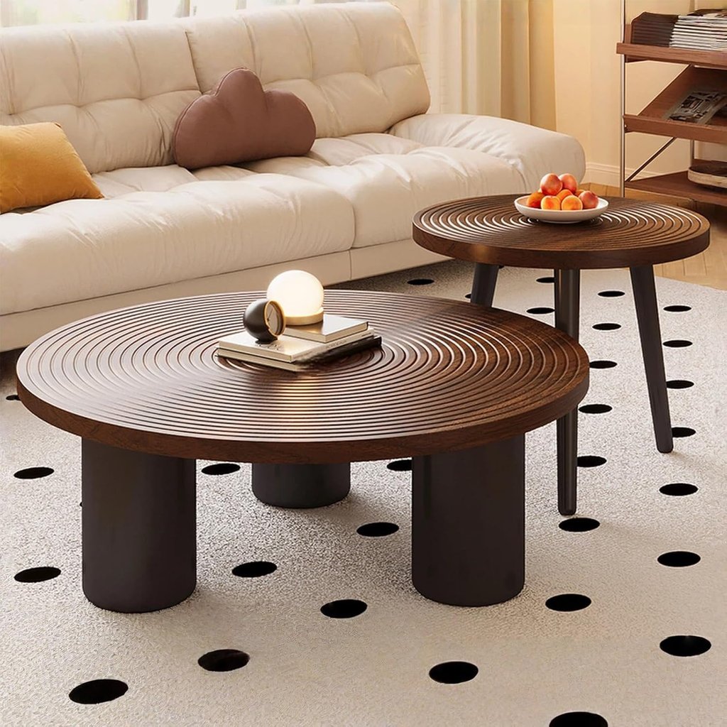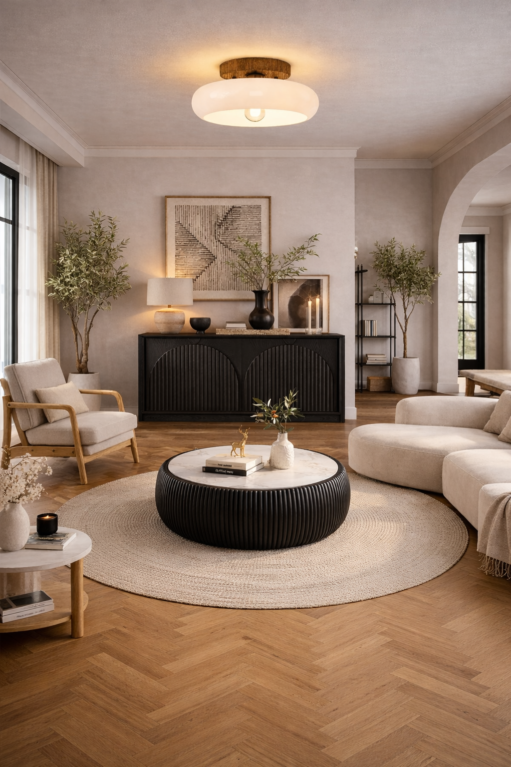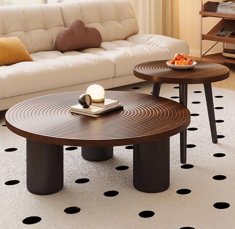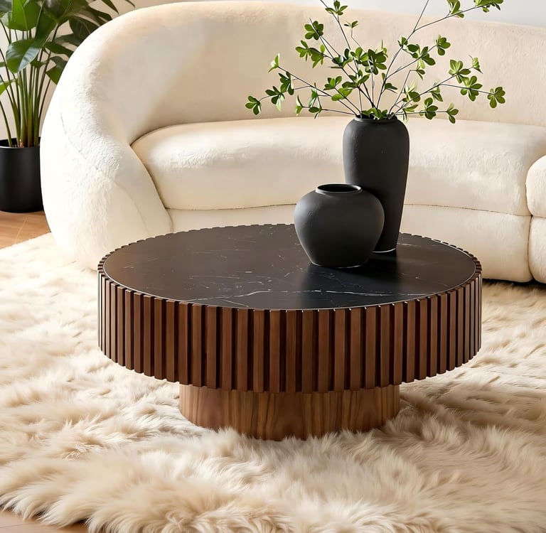 While Scandi design loves light woods, Japanese interiors often bring in darker, richer tones. A round or oval coffee table with ribbed or fluted detailing in dark walnut creates a stunning focal point against a light rug.