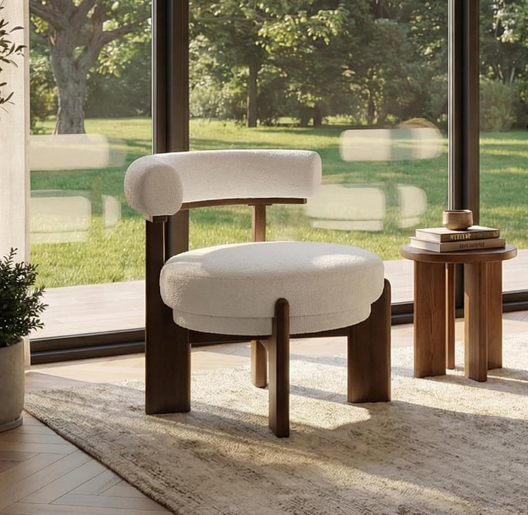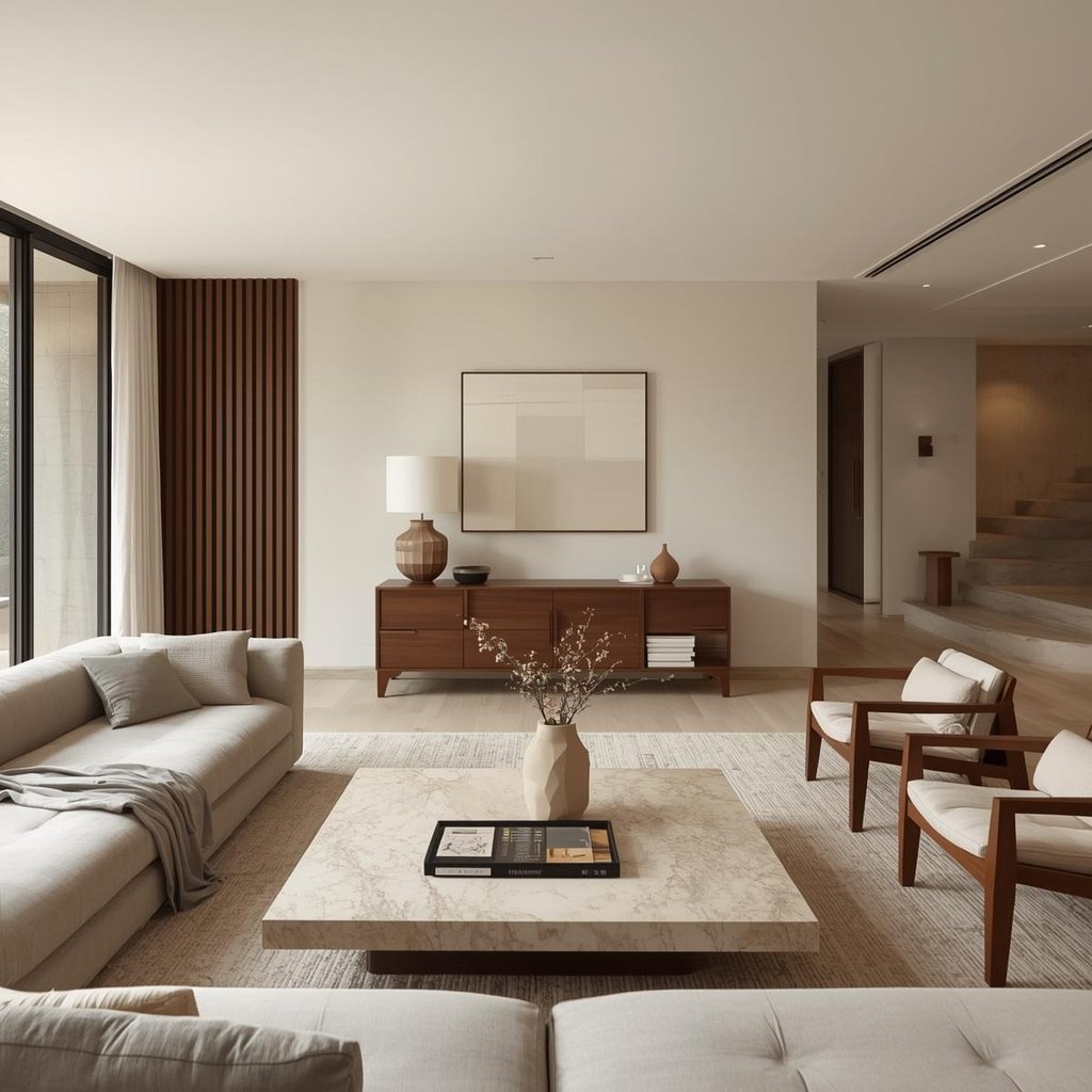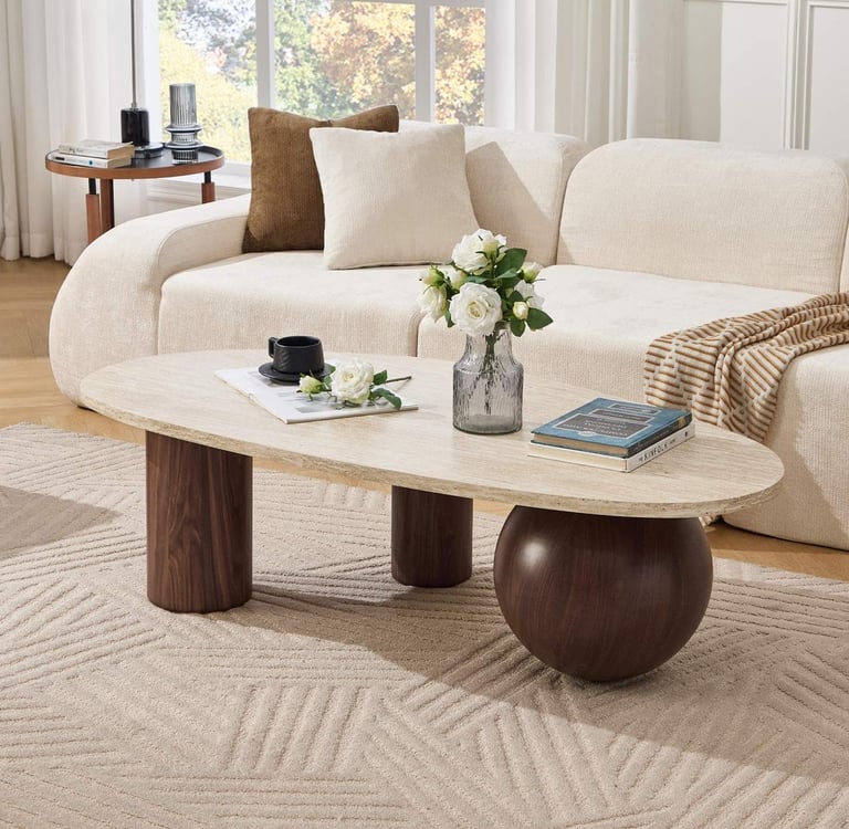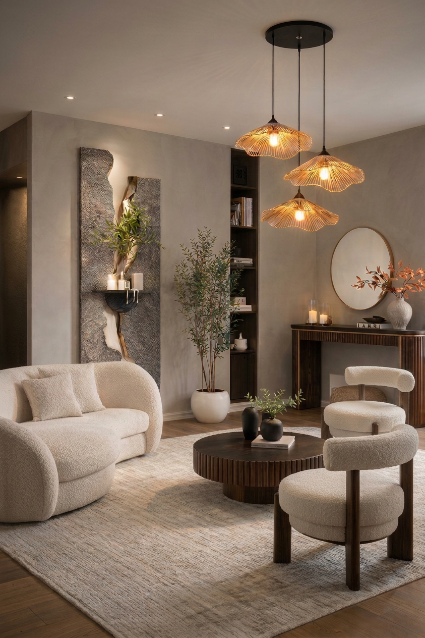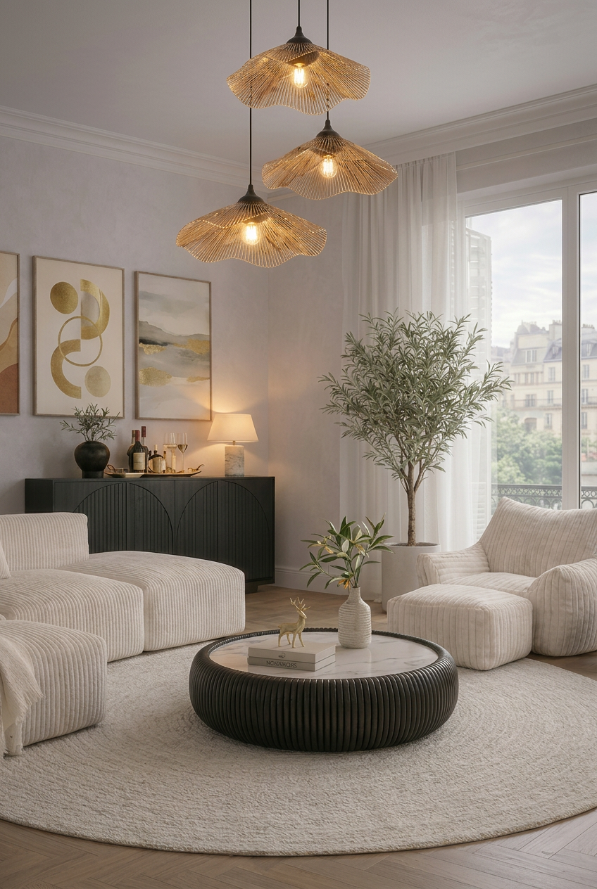 While Scandi design loves light woods, Japanese interiors often bring in darker, richer tones. A round or oval coffee table with ribbed or fluted detailing in dark walnut creates a stunning focal point against a light rug.
