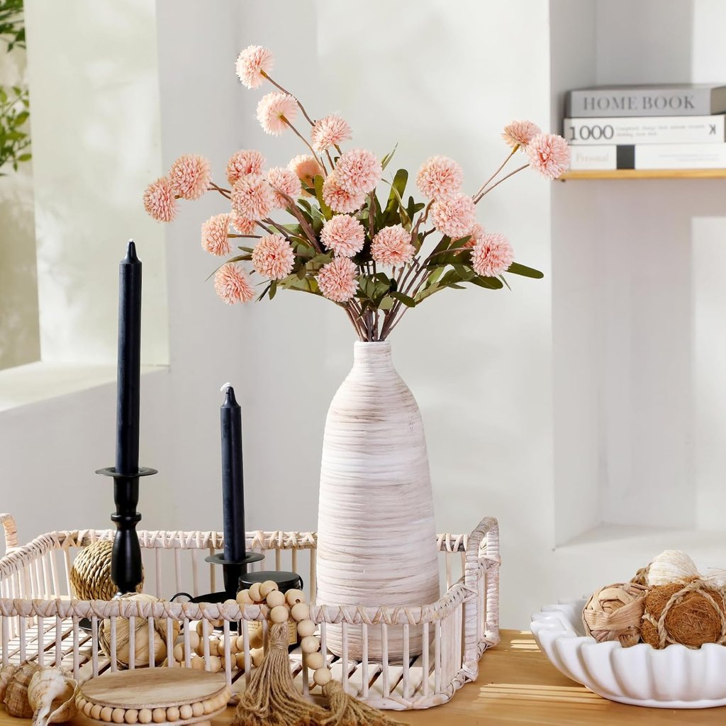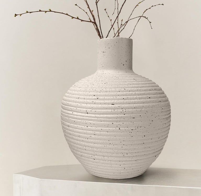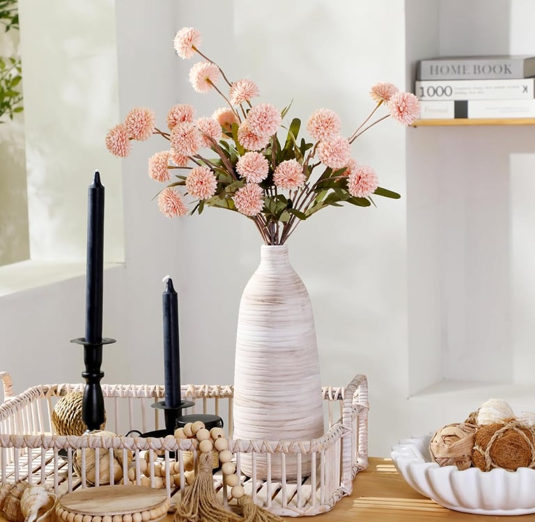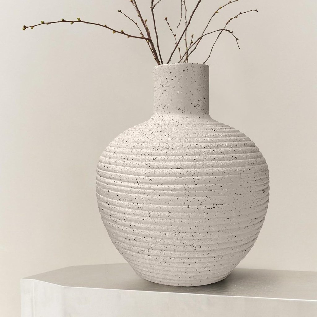 ✨ Get the Look: A set of textured, neutral donut vases or rustic stoneware.