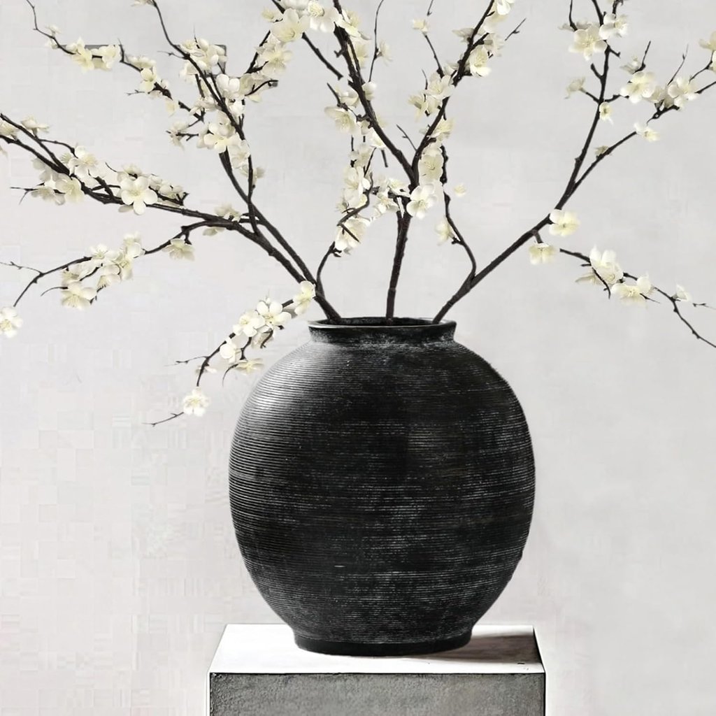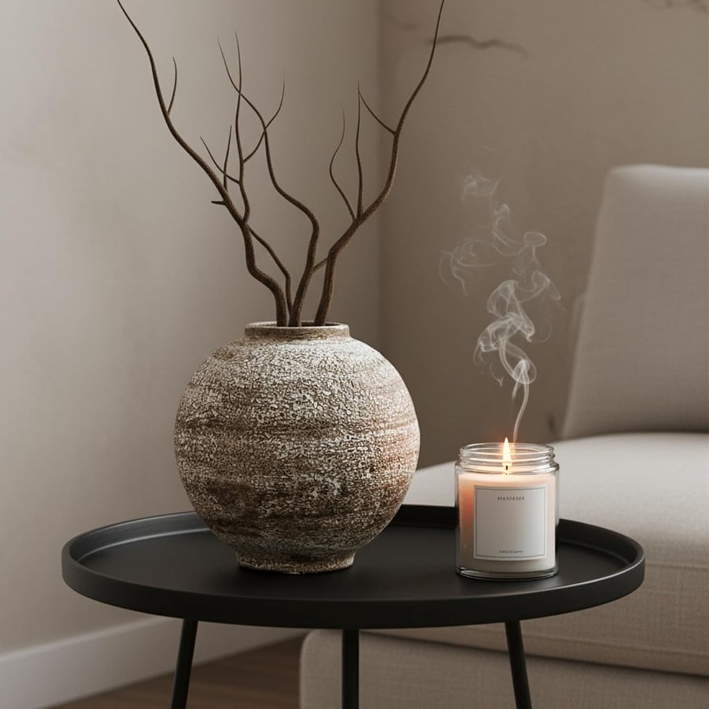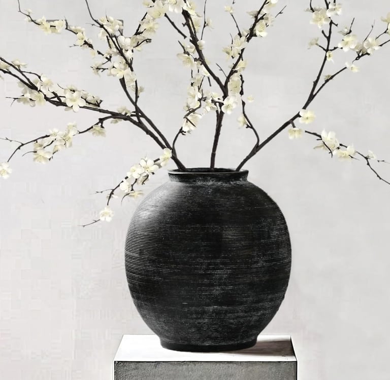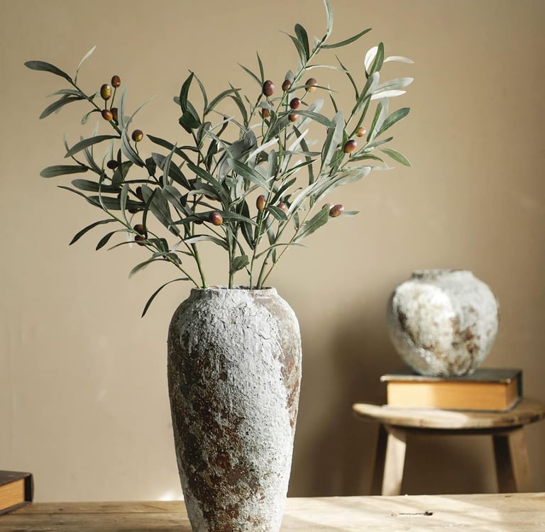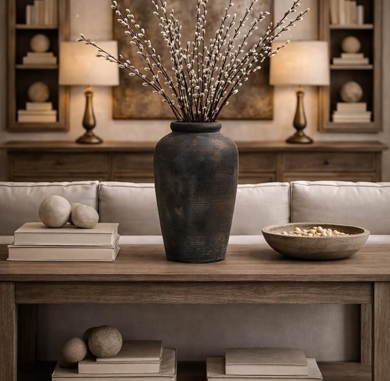 ✨ Get the Look: A set of textured, neutral donut vases or rustic stoneware.
