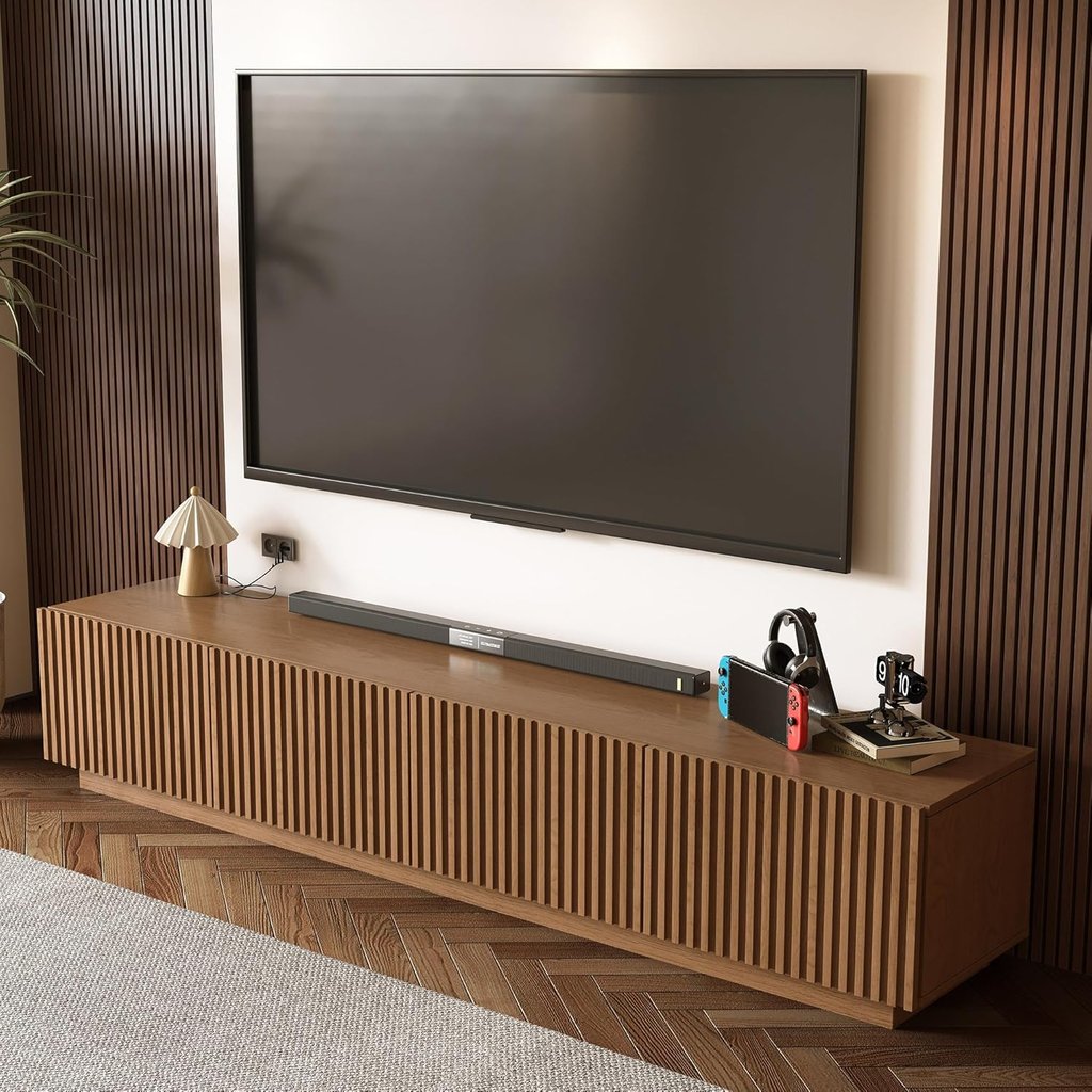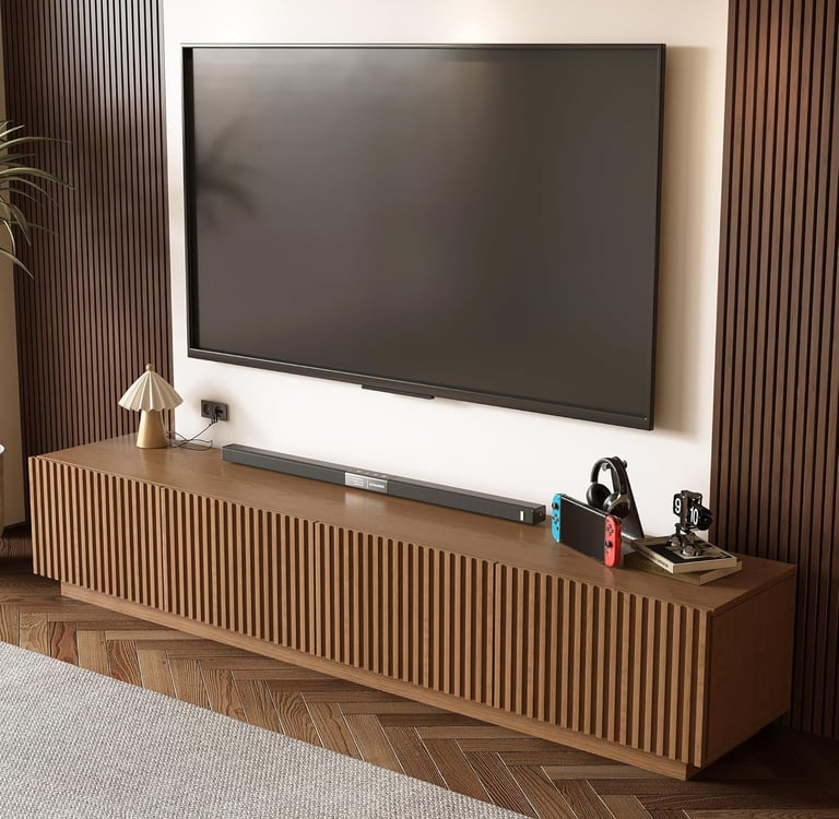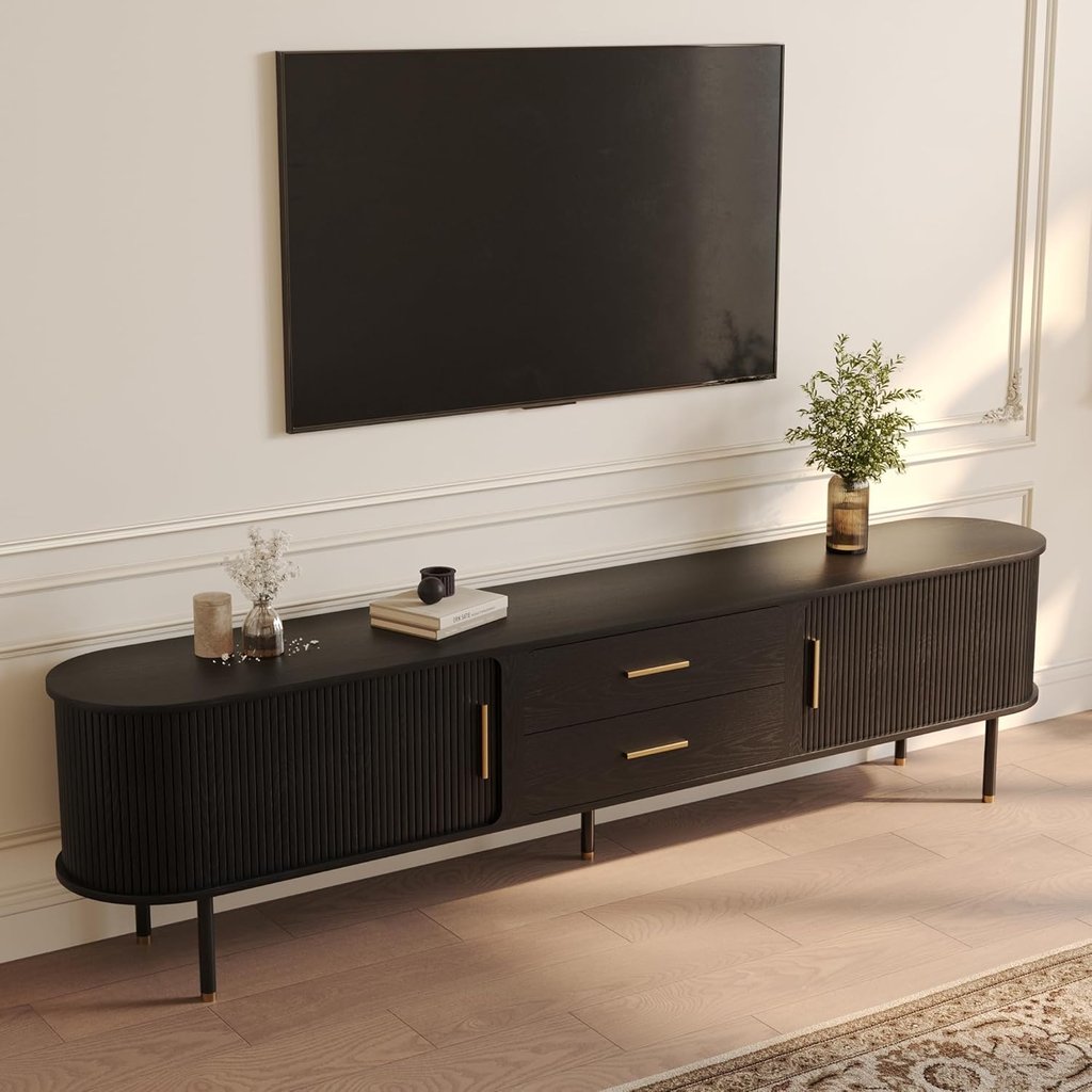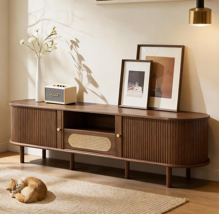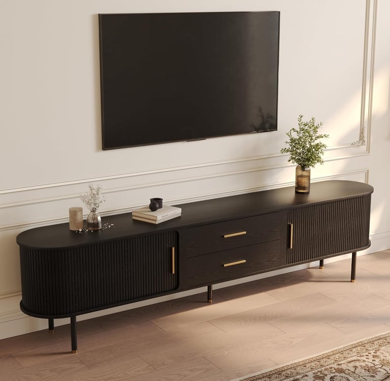 ✨ Get the Look: A low-profile, minimalist media cabinet in light oak or matte black.
