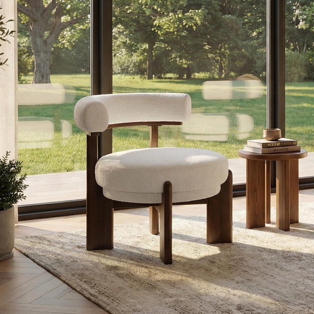 Upholstered Barrel Chair Faux Sherpa Comfy Side Chair with Wooden Frame