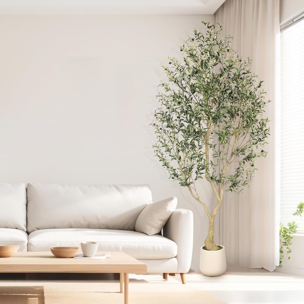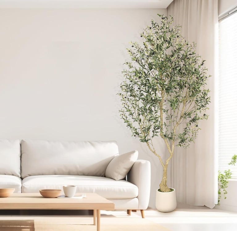 🤍 Curated Amazon Find: A realistic, tall faux olive tree planted in a simple stone pot.