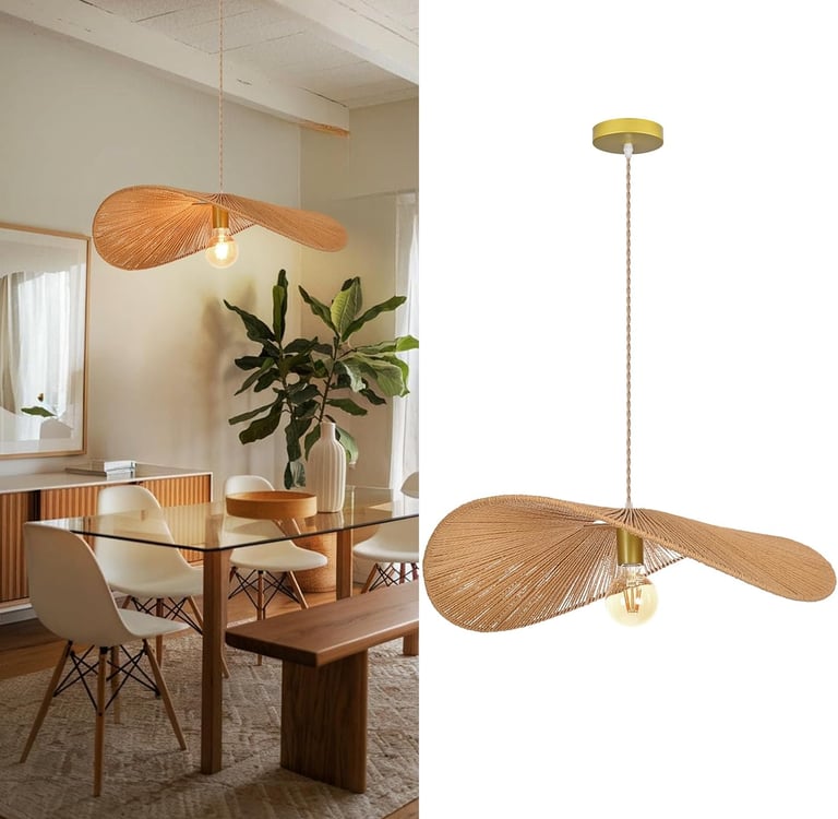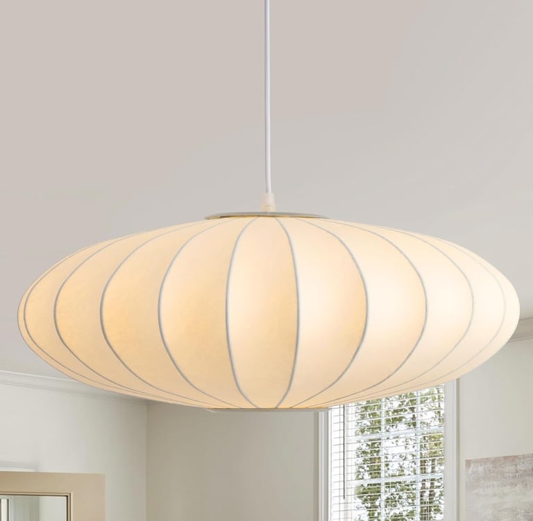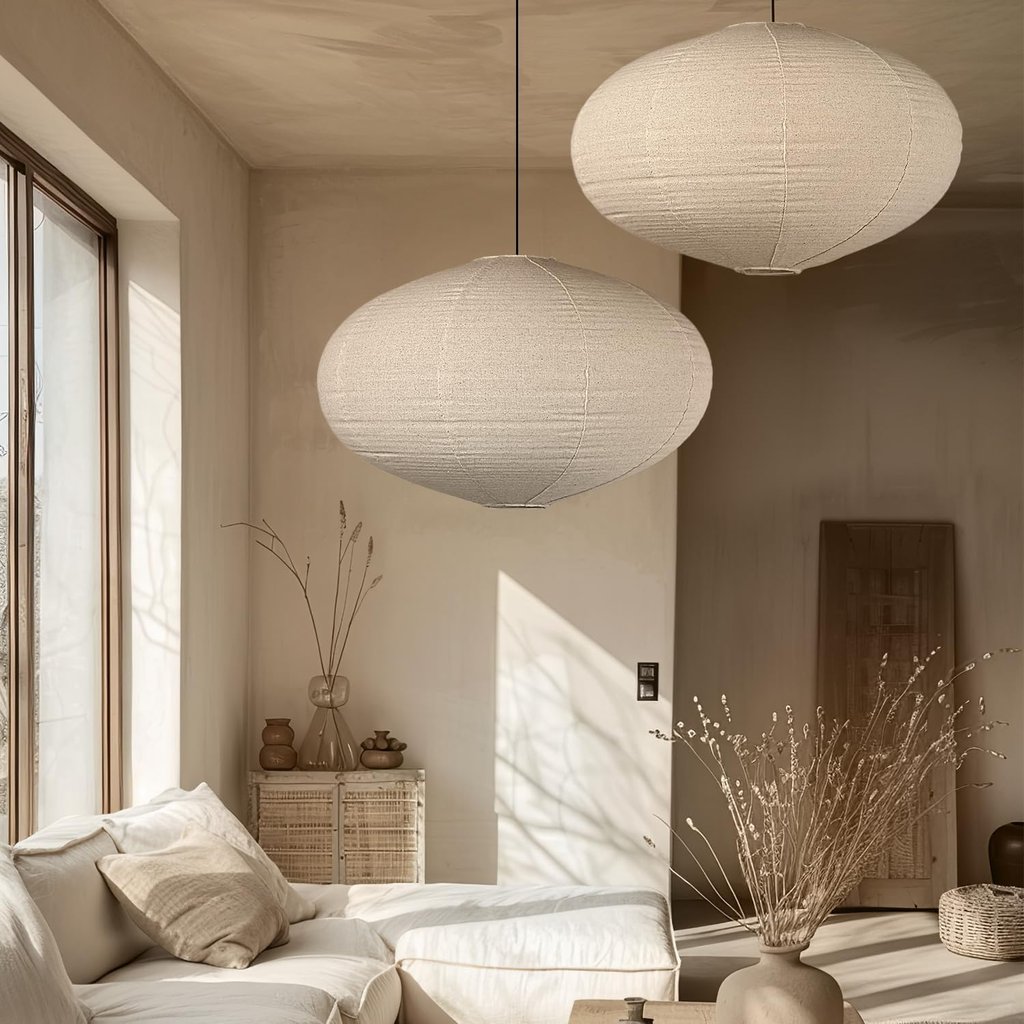 Nothing says Japandi quite like paper lighting. A large ribbed rice paper pendant diffuses light beautifully, creating that soft, glowing, Zen atmosphere that makes a house feel like a home.