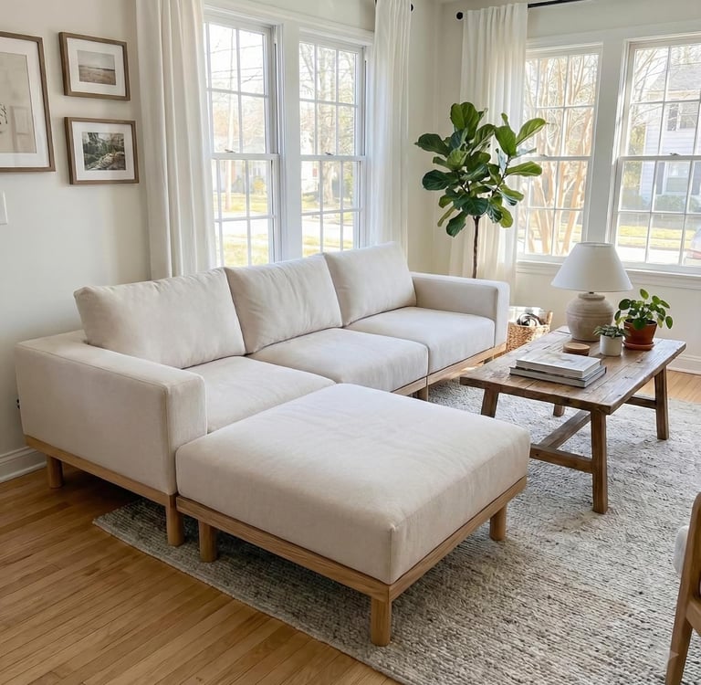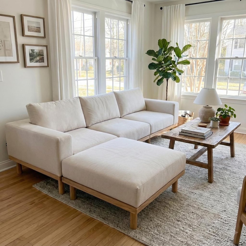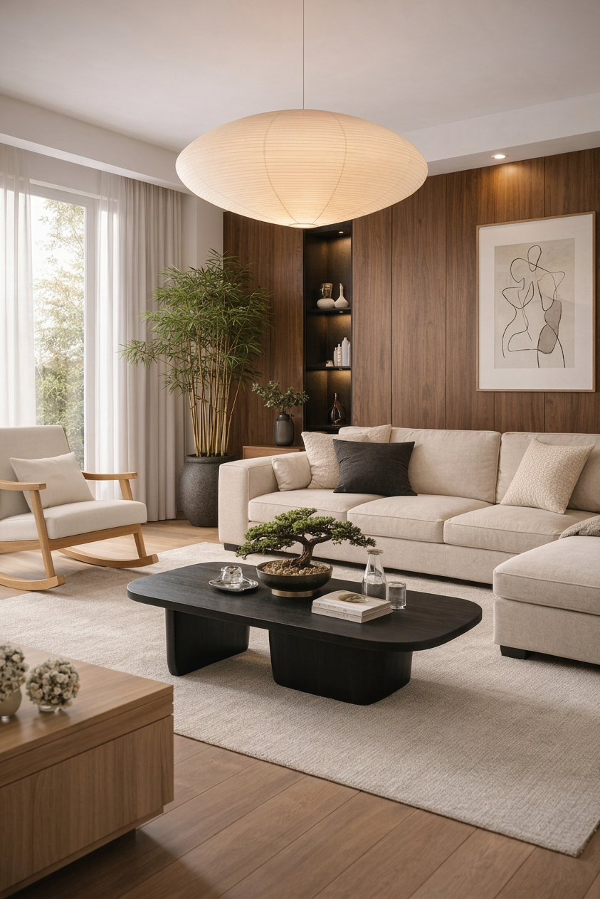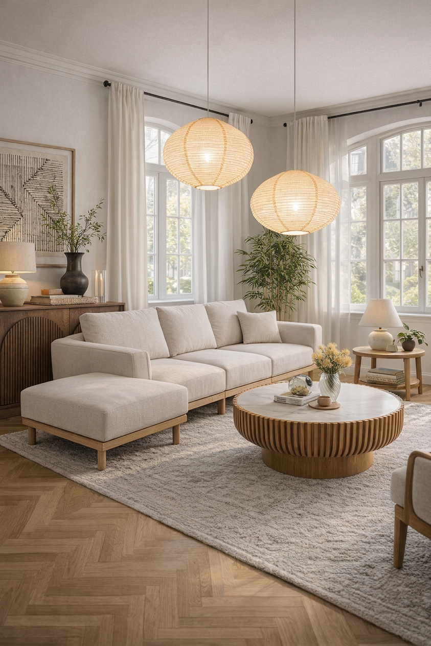 Japandi design emphasizes a connection to the ground, so low-profile furniture is a must. A cream or light beige modular sofa in a textured fabric (like boucle or linen) acts as the perfect, airy foundation for the room.