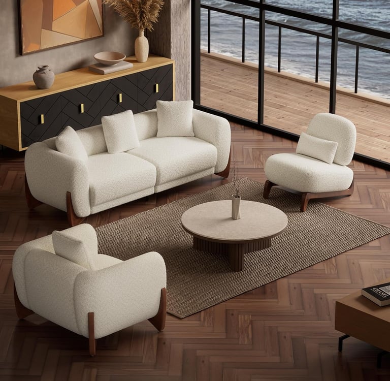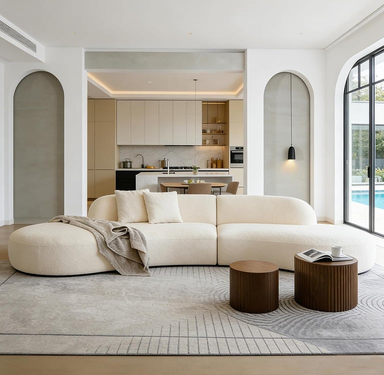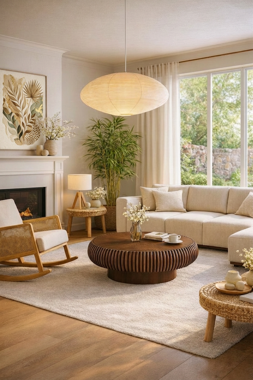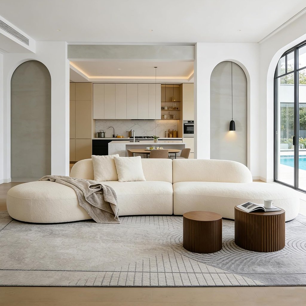 Japandi design emphasizes a connection to the ground, so low-profile furniture is a must. A cream or light beige modular sofa in a textured fabric (like boucle or linen) acts as the perfect, airy foundation for the room.