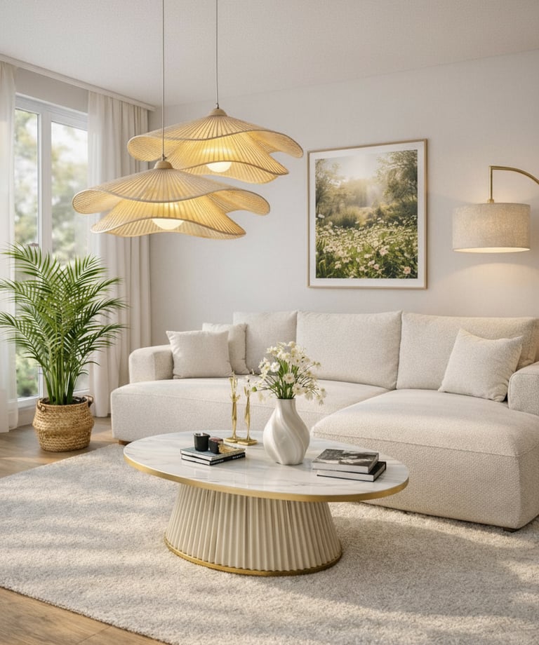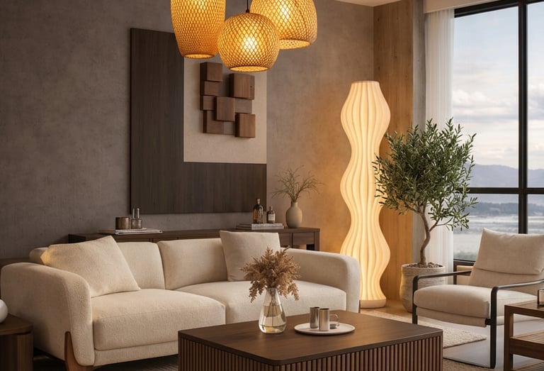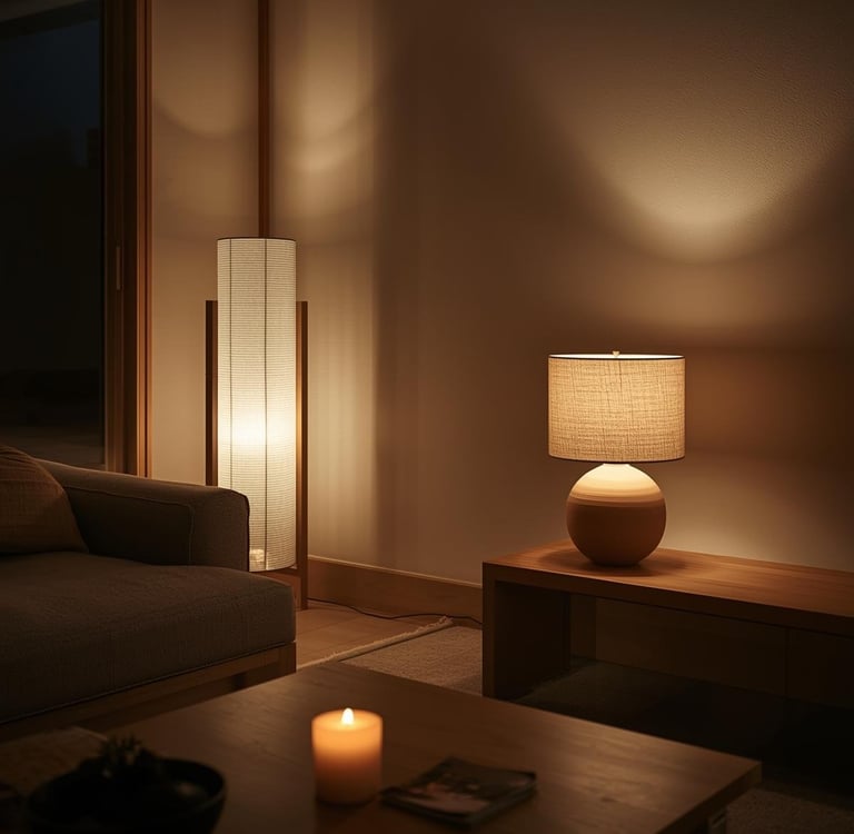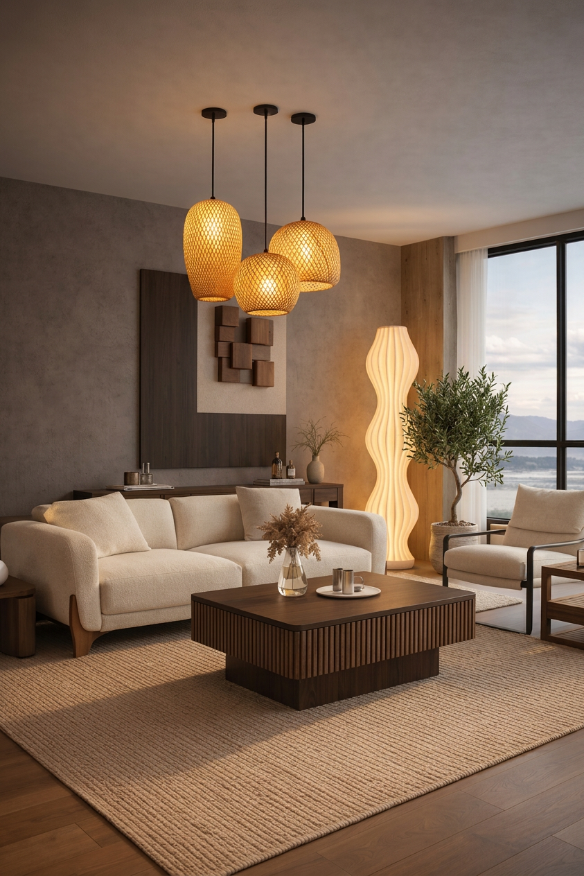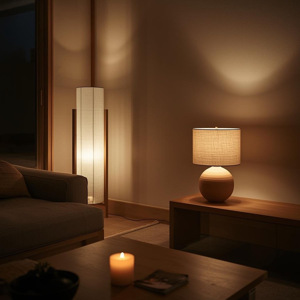 Overhead lighting can be harsh. For true Japandi coziness, rely on ambient lighting. A minimalist arched floor lamp or a low-sitting paper floor lamp adds the perfect evening glow.