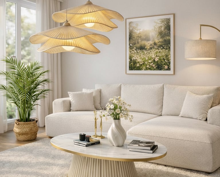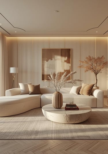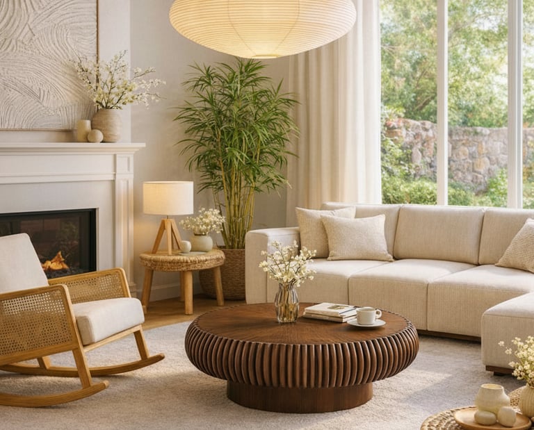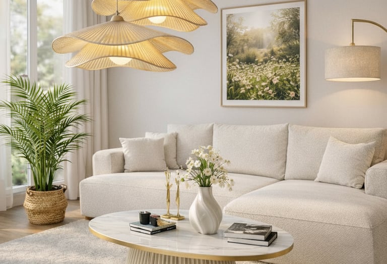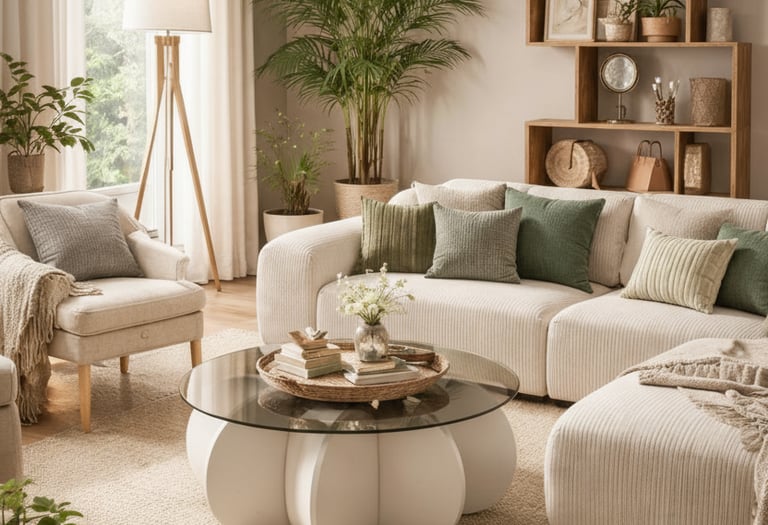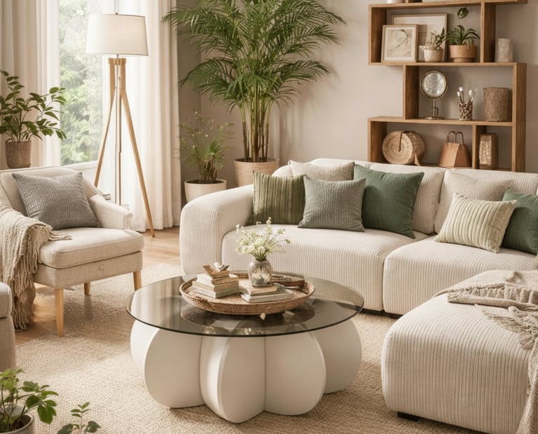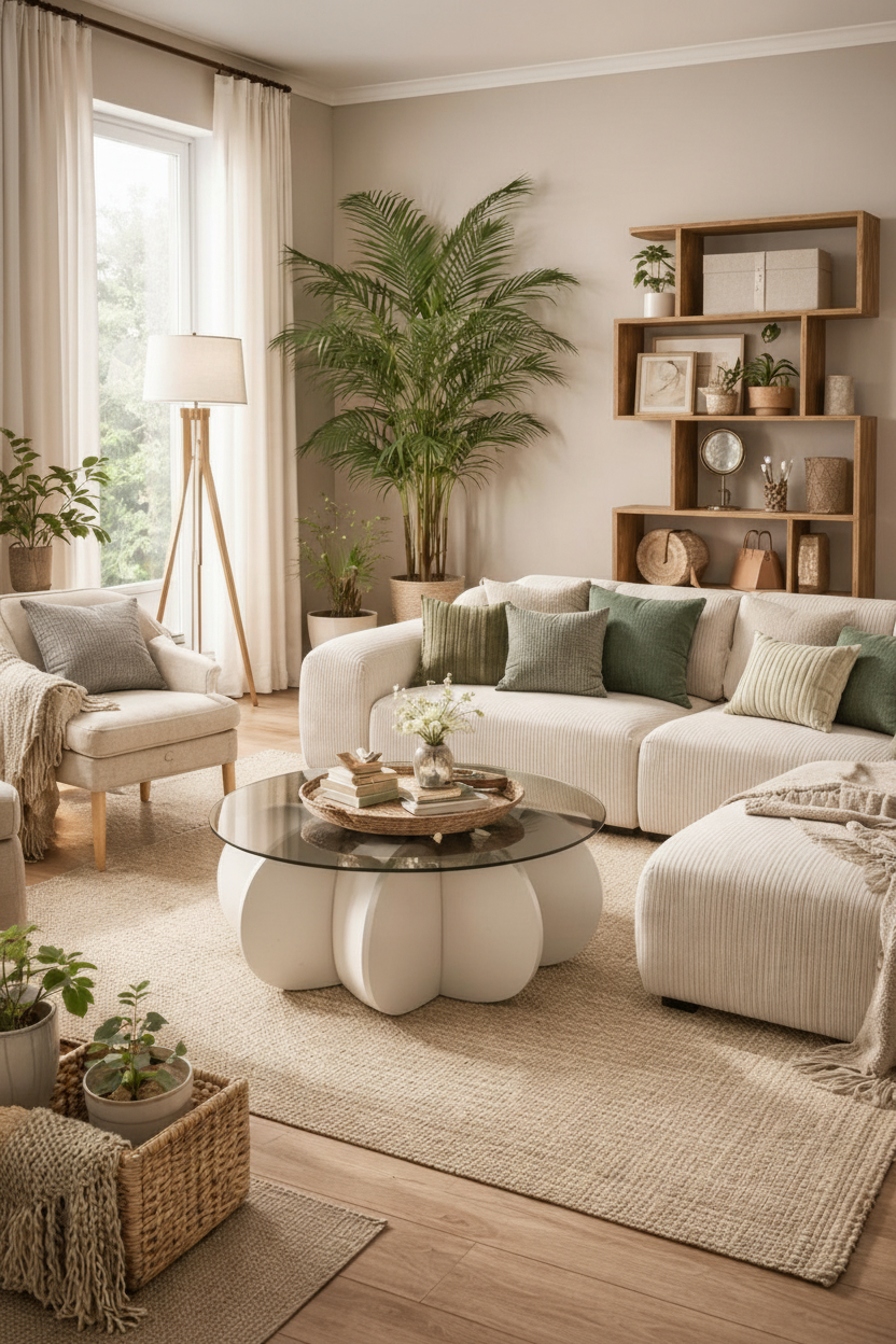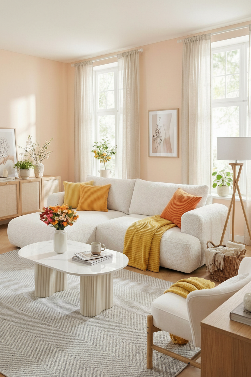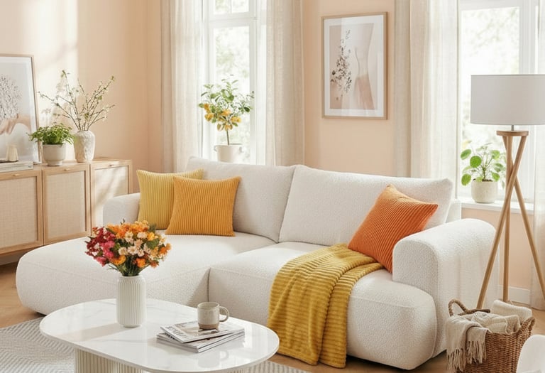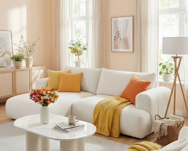 Cream sofa with warm pillows, Mustard or terracotta accents, Light wood furniture, Fresh flowers
