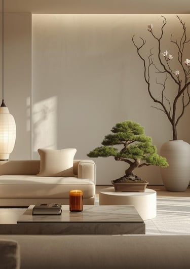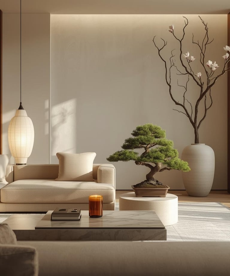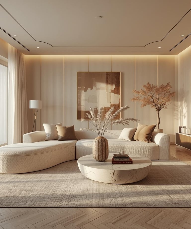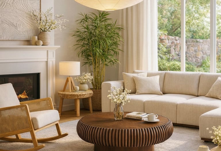 Think soft beige sofas, wood textures, linen fabrics, and subtle greenery.